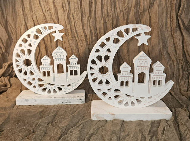 Cette pièce représente un croissant de lune délicatement ajouré, accompagné d’une silhouette de mosquée et d’étoiles finement travaillées. Coulée à la main en résine de plâtre, chaque création est unique et révèle de subtiles nuances naturelles.