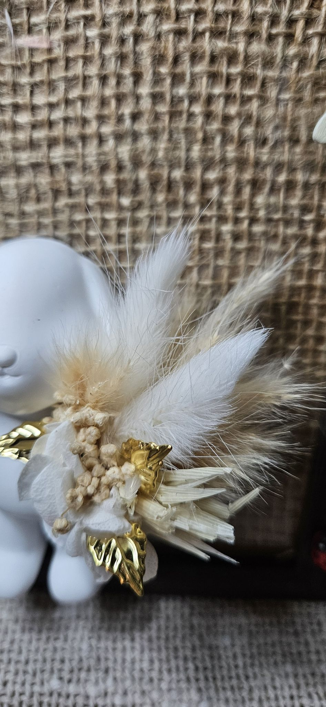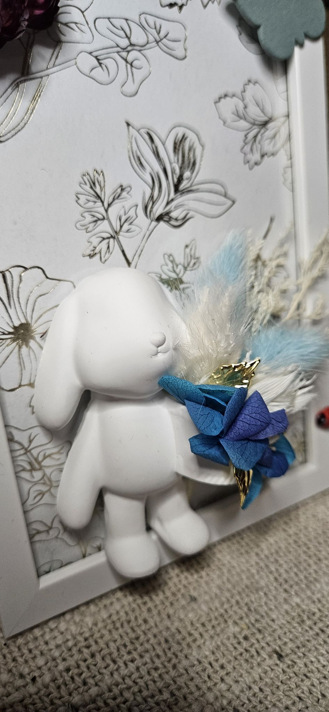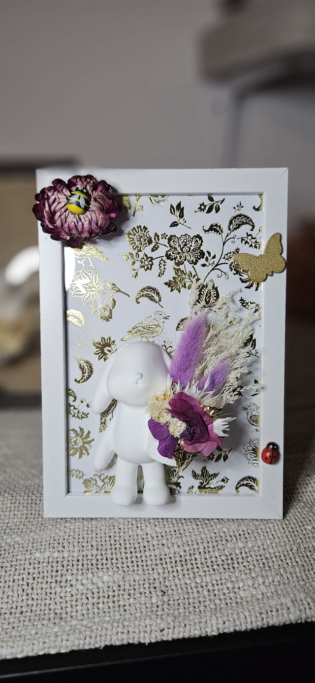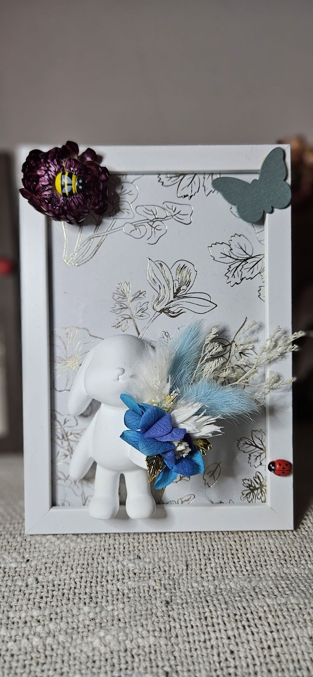 Cadre décoratif avec figurine lapin, décoré à la main et sublimé par une composition de fleurs sèches. Chaque cadre met en scène un petit lapin accompagné d’un bouquet délicat, aux couleurs douces ou plus contrastées selon le modèle.