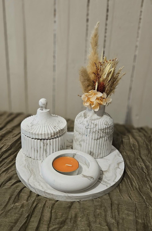 Ce lot décoratif apporte une touche douce et élégante à votre intérieur. Il se compose d’un plateau, d’un photophore, d’un vase et d’une boîte décorative, pensés pour être disposés ensemble ou séparément selon vos envies.